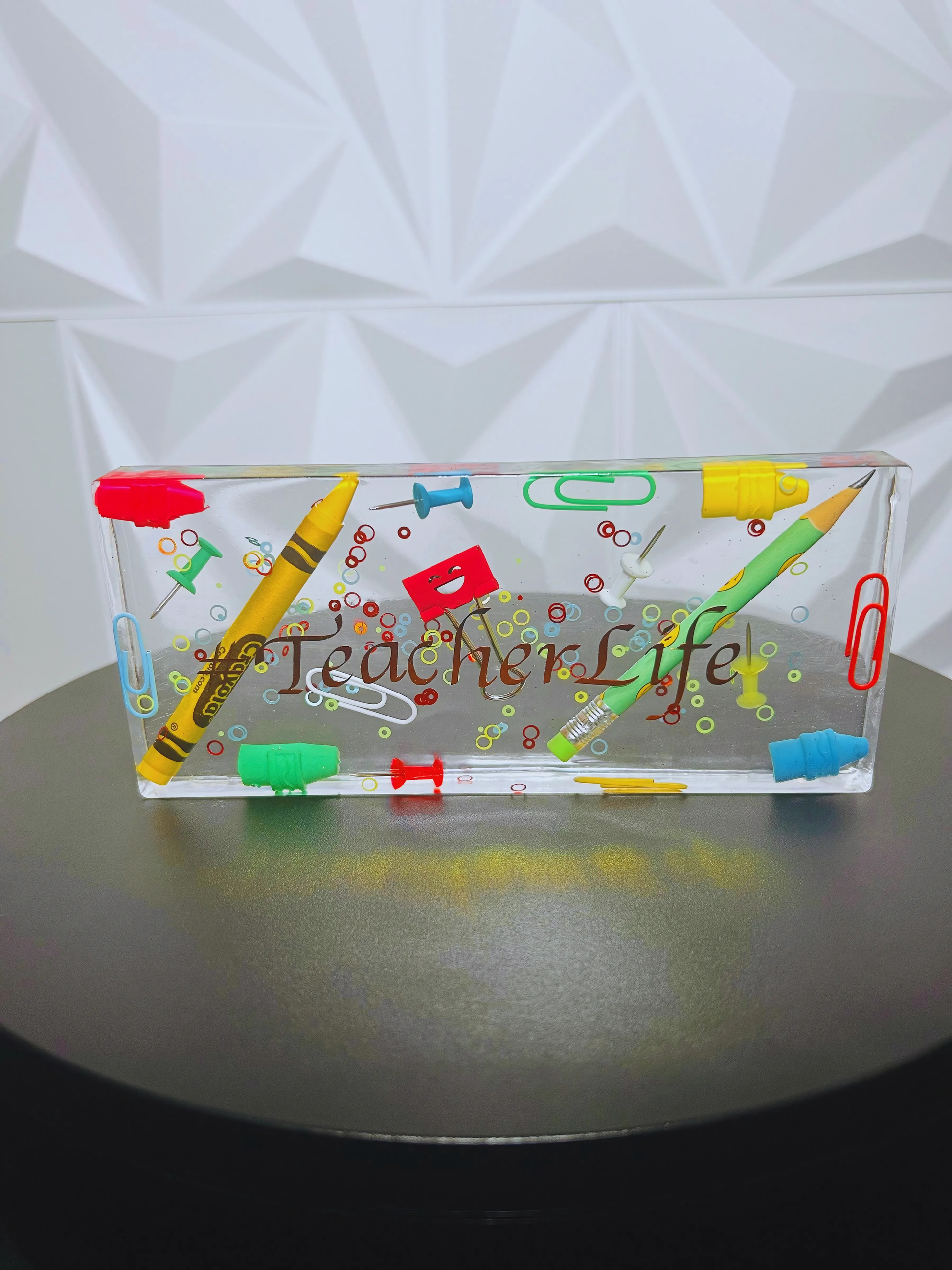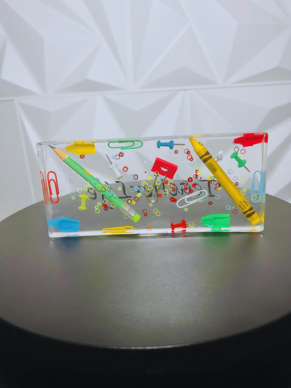 This beautifully crafted nameplate features vibrant school supplies embedded within a smooth epoxy resin, giving it a fun and professional look. You can personalize it with your name or a custom message, making it the perfect addition to your desk or office.
